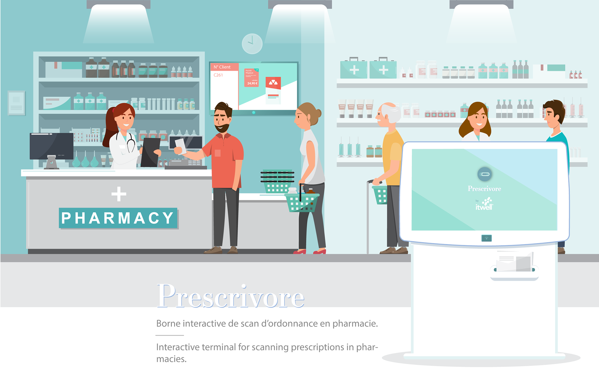 Prescrivore is an interactive terminal for scanning prescriptions in pharmacies. The scanned prescription gets into a digital ticketing system, and the client is notified when his order is ready.